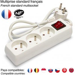 6,90 €Bloc 3 prises 16A (2P+T). Câble: 1 mètre, H05VV-F 3G1.0mm². Bloc multiprise équipé d'une protection enfants et d'un interrupteur lumineux. Certifié NF. Puissance Max 3680W sous 230V. Pratique pour couvrir les besoins domestiques en raccordements électriques.