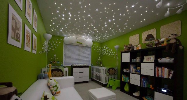 Nos kits contenant des fibres optiques vous permettent de pouvoir recréer une atmosphère magique, une ambiance de ciel de nuit d’été dans votre salon, salle de cinéma, au dessus de votre piscine intérieur, dans la chambre des enfants, etc. Pour vous donner un aperçu de ce que cela pourrait donner dans la chambre de vos enfants, vous pouvez admirer la photo ci-dessous !
